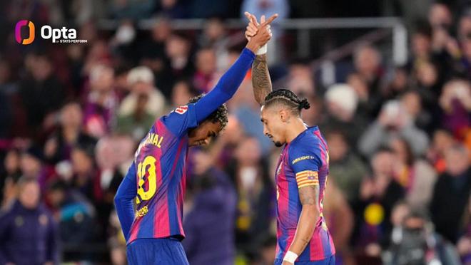 拉菲尼亚巴萨生涯禁区外打入10球,与亚马尔并列同期队内最多