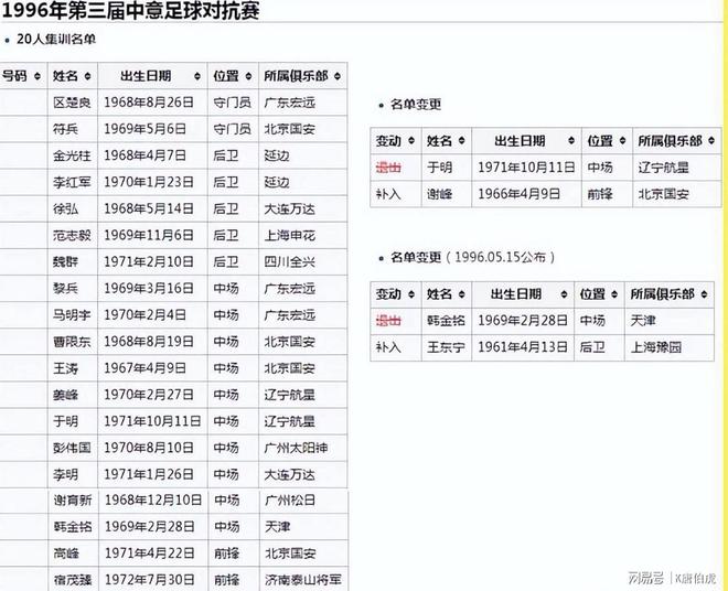 1996年第三届中意足球对抗赛大名单里,门将方面是区楚良、符兵,后防线新增了金关柱和李红军,中场方面新增了姜峰、李明和谢育新等人,锋线上有黎兵和宿茂臻等。