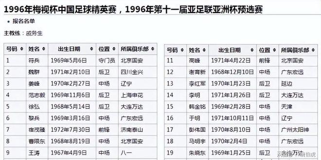 最后来看一下当年的几次国家队名单,所涵盖的球员也基本都是以此年度最佳阵容为基础而定。作为1996年时任国奥和国家队主教练的戚务生曾多次大范围选拔国足球员,但是万变不离其宗的原理却贯穿始终。