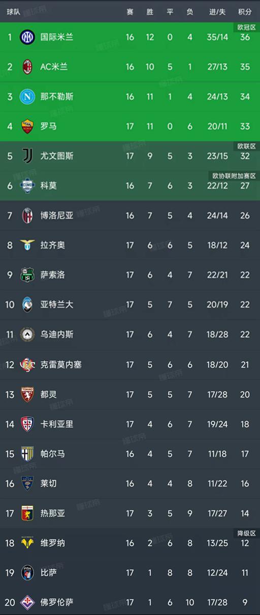 北京时间12月30日意甲日报,随着罗马3-1战胜热那亚,意甲第17轮的比赛全部结束,我们一起看看最新积分榜变动!