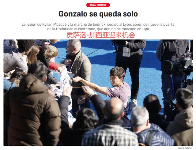 姆巴佩受伤,恩德里克外租,贡萨洛-加西亚是皇马唯一的正印中锋。未来4-5场比赛,贡萨洛-加西亚都有希望出任首发中锋。《阿斯报》表示,皇马主帅阿隆索很信任贡萨洛-加西亚,去年6-7月的世俱杯,就是最好的证明。
