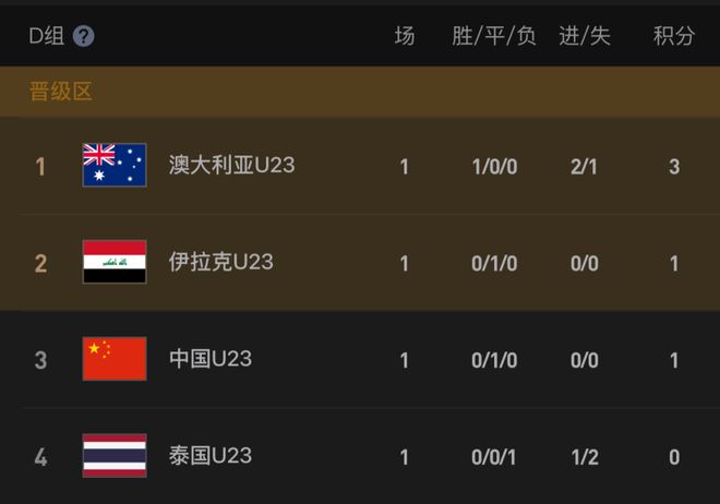 小组首轮,U23国足0-0战平伊拉克,而澳大利亚2-1逆转十人泰国。首轮战罢,澳大利亚3分领跑,伊拉克1分小组第2,U23国足同积1分,但因为多吃1张黄牌屈居第3,而泰国队0分垫底。